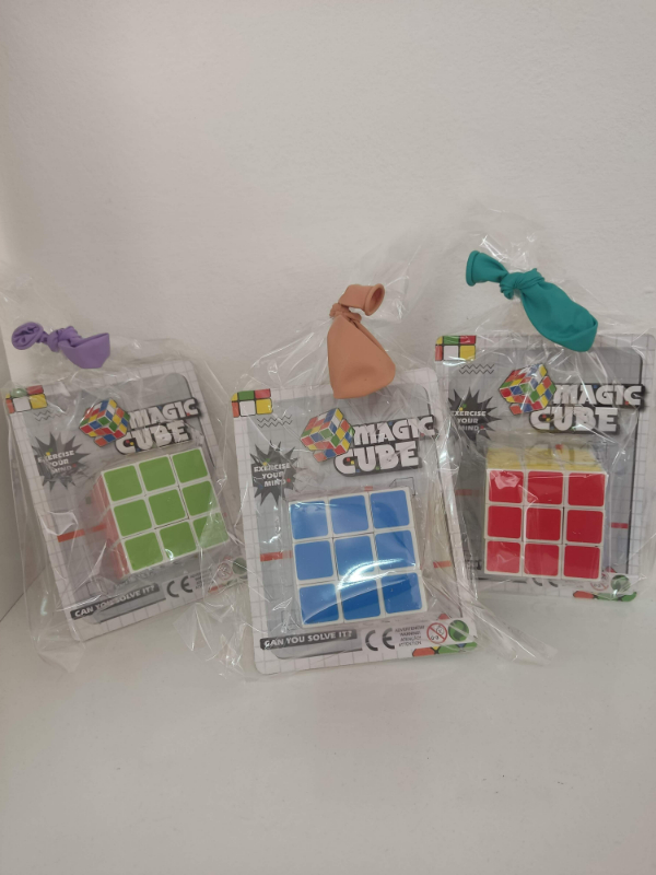 Cubo de Rubik, detalle divertido y educativa para regalar en cumpleaños, comuniones, bautizo,... a niños a partir de tres años. Presentado en bolsita de celofán con globo.