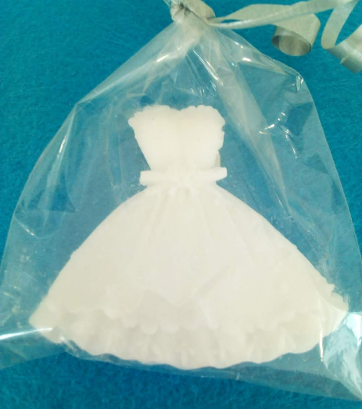 Los vestidos de jabón de glicerina es un detalle ideal para regalar en bodas, comuniones,.... Mide aprox. 6,5 cm de alto . El precio incluye inicial de jabón en bolsita de celofán con etiqueta.