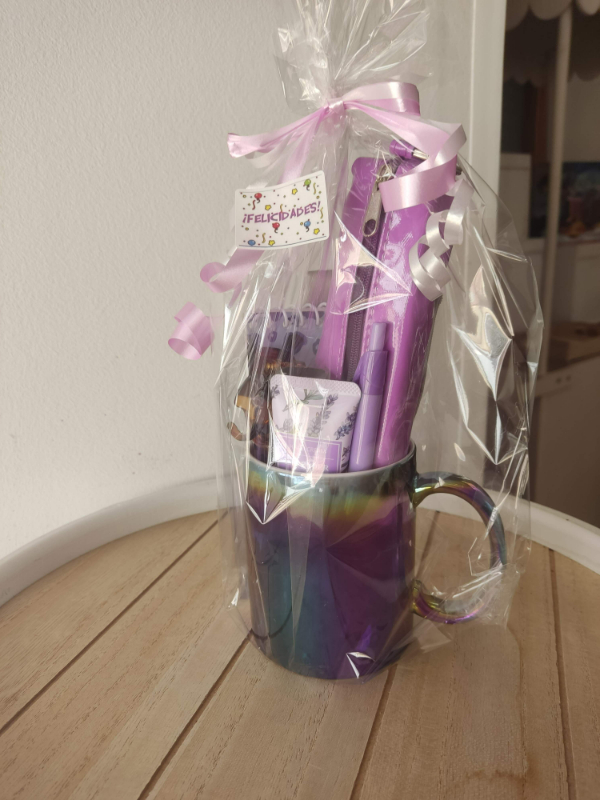 El pack taza regalo en tonos morados incluye los siguientes productos: taza de cerámica, libreta pequeña, estuche porta todo, bolígrafo, pinza pelo ,monedero.