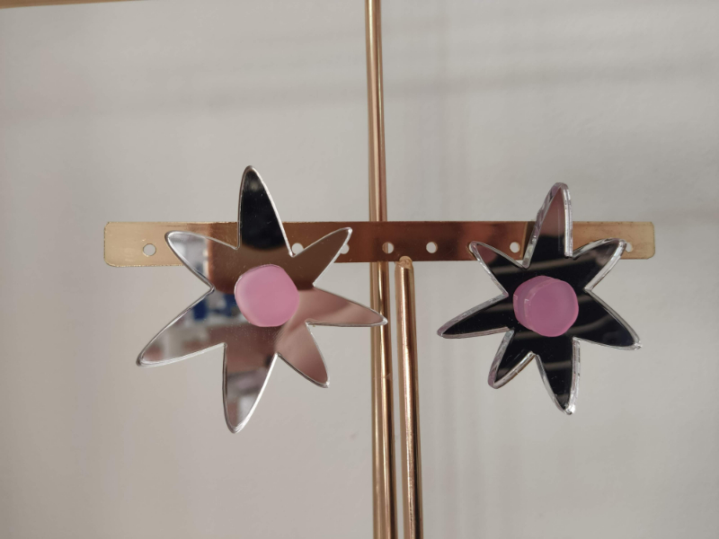 Pendientes flor estrellada de metacrilato en plata espejo y rosa.